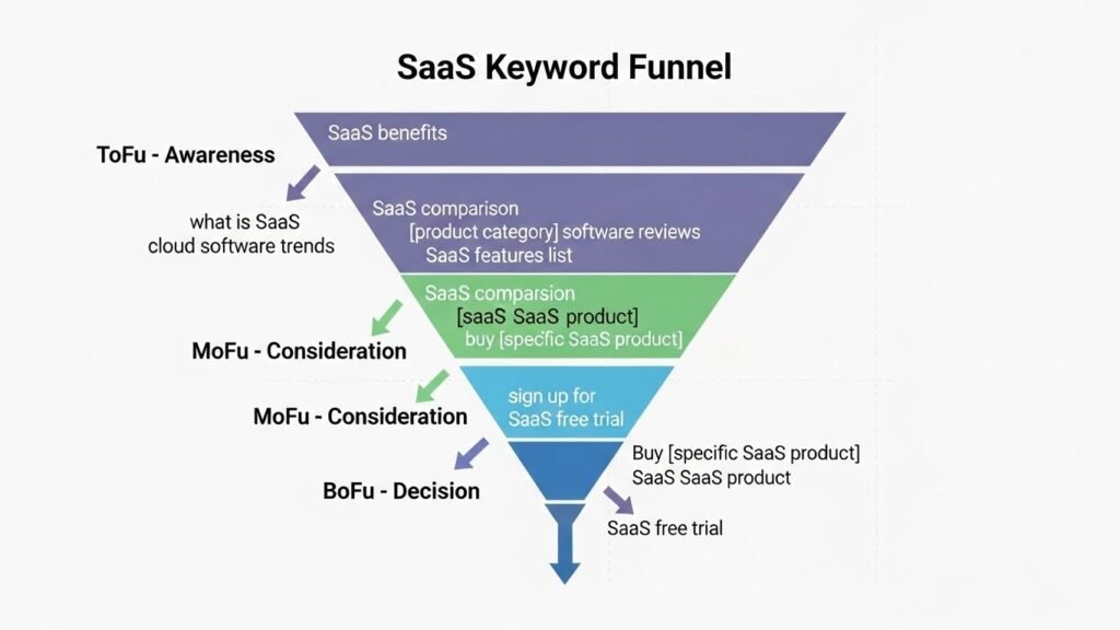 [IMAGE: SaaS keyword funnel showing ToFu to BoFu movement]